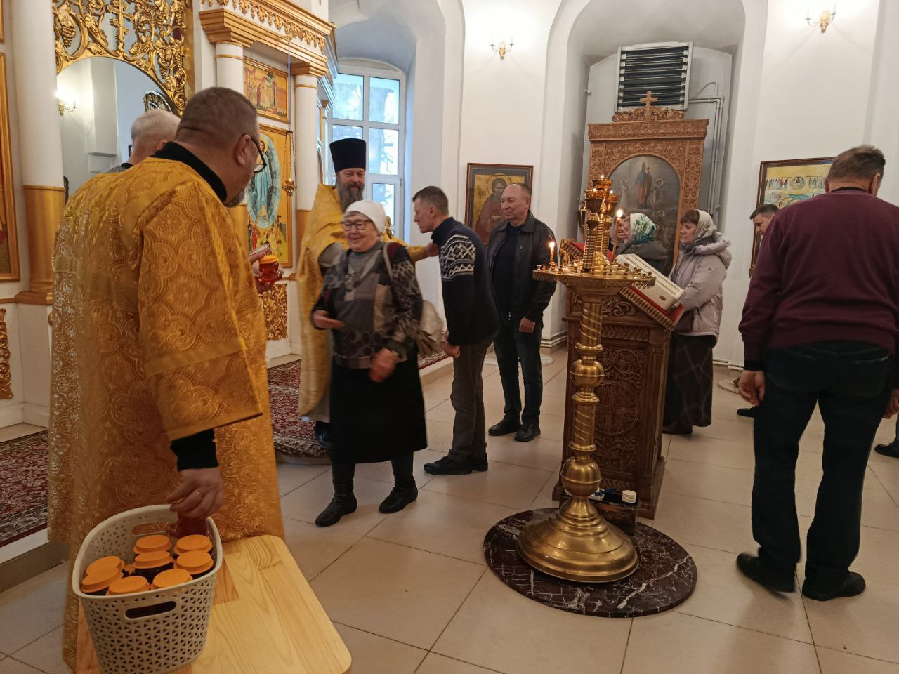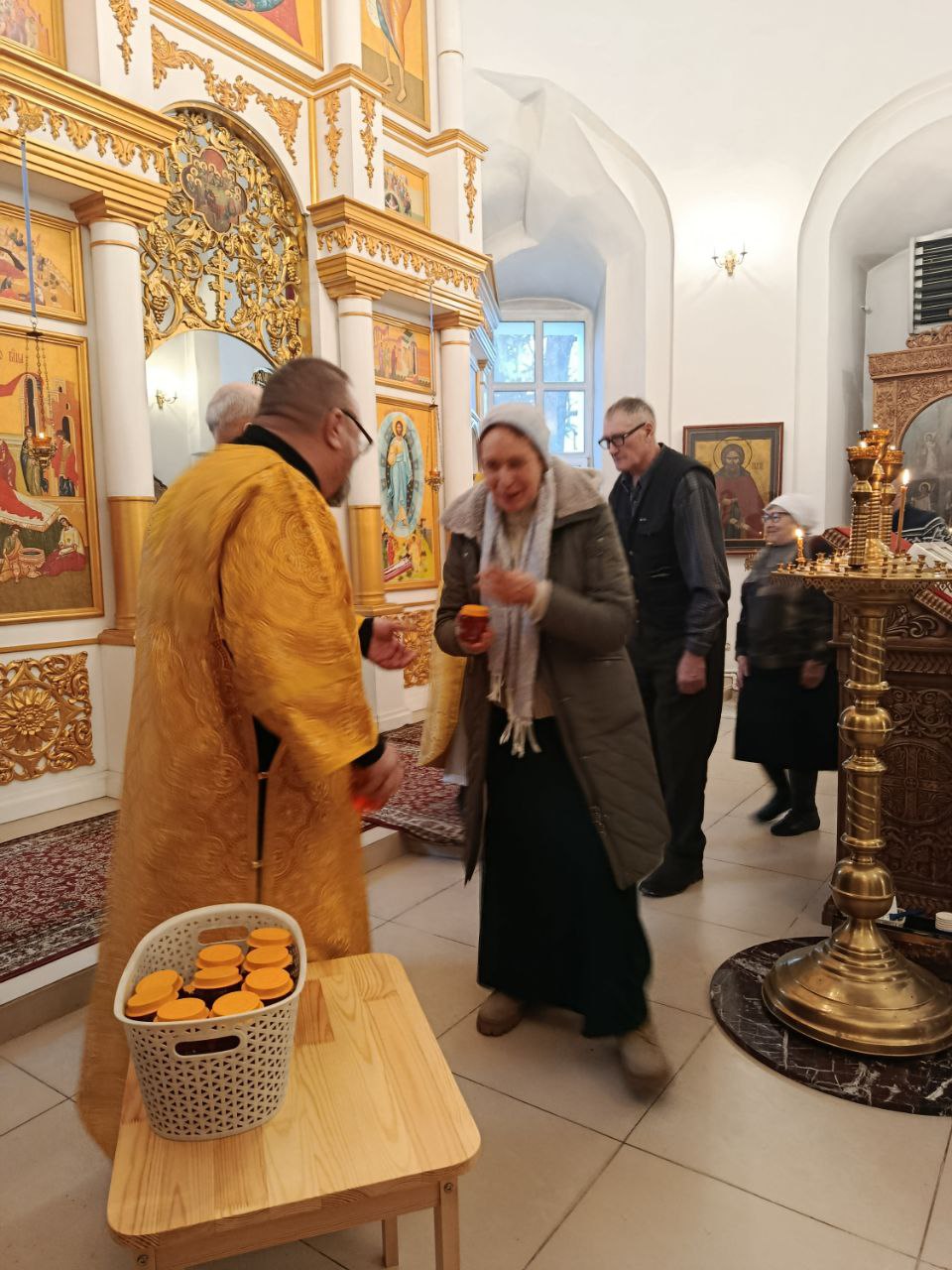 По окончании богослужения отец Владимир поздравил всех прихожанок с днём Матери и вручил сладкий подарок и четырёхчастную икону "Материнство", на которой собраны четыре образа Матери Божией: "Млекопитательница", "В родах Помощница", "Взыграние Младенца" и "Воспитание".