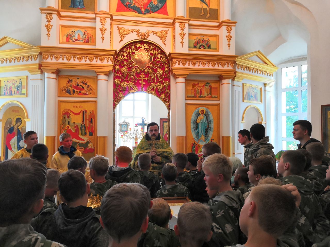 На богослужении молились и причастились Святых Христовых Таин курсанты и наставники военно-полевого лагеря клуба "Пересвет" православного братства имени святого благоверного князя Димитрия Донского при Успенском соборе г. Коломны. Всего было около 100 причастников.