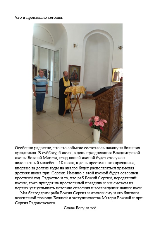 Особенно радостно, что это событие состоялось накануне больших праздников. В субботу, 6 июля, в день празднования Владимирской иконы Божией Матери, пред нашей иконой будет отслужен водосвятный молебен. 18 июля, в день престольного праздника, впервые за долгие годы на аналое будет располагаться храмовая древняя икона прп. Сергия. Именно с этой иконой будет совершен крестный ход. Радостно и то, что раб Божий Сергий, передавший иконы, тоже приедет на престольный праздник и мы сможем из первых уст услышать историю спасения и возвращения наших икон.