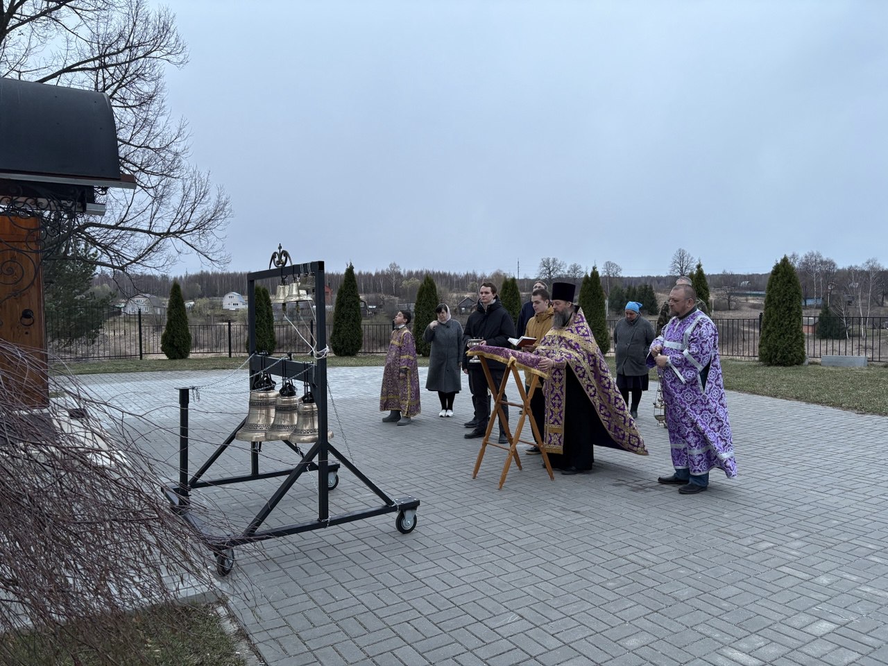 5 апреля 2025 года в канун дня памяти святителя Тихона,патриарха Московского и всея Руси,после Всенощного бдения , настоятель Богородицерождественского храма д. Богородское протоиерей Владимир Пахачев совершил освящение малой передвижной звонницы, созданной на приходе.